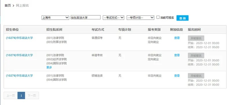 4.考生登录报名界面后,在界面上方的选择栏目中进行选择。省市选择“上海市”;学校选择“华东政法大学”;普通招考考生“考试方式”选“普通招考”、申请考核制考生“考试方式”选择“申请考核”、法律史、民商法学、国际法学专业硕博连读考生“考试方式”选择“硕博连读”;专项计划均填“无”。即可看到“开始报名”按钮。