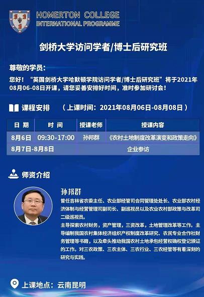 剑桥大学博士后研究班预计将于2021年8月06日-8月08日在云南上课,请各位同学安排好时间,准时参加研讨会!