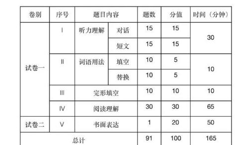 试卷分为试卷一(Paper One)和试卷二(Paper Two)。试卷一包括听力(30%)、词语用法(10%)、完型填空(10%)和阅读理解(30%),答卷时间115分钟;试卷二包括书面表达(20%),答卷时间50分钟。