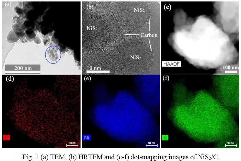 该论文针对NiS2纳米化后高温稳定性降低的问题,开发了一种碳包覆制粒技术,构建了纳微结构的NiS2-C复合材料(已申请国家发明专利,201810189138.9)。其高温起始分解温度从400℃左右大幅提升到590℃,不仅比容量提高,而且在650℃实现了有效放电,对延长热电池实际工作寿命具有重大意义。该论文还发现了在纳微结构NiS2-C复合材料中存在多级碳,并揭示了其在提高纳米NiS2高温稳定性和放电性能的作用机制:当热电池点火温度瞬间升高到800℃以上时,包覆碳抑制了NiS2高温分解产物特别是单质硫的逸出,限制了其分解反应的进行,骨架碳稳定了电极结构,在随后的降温过程中分解产物又化合生成NiS2,成为稳定放电阶段的活性正极材料。
